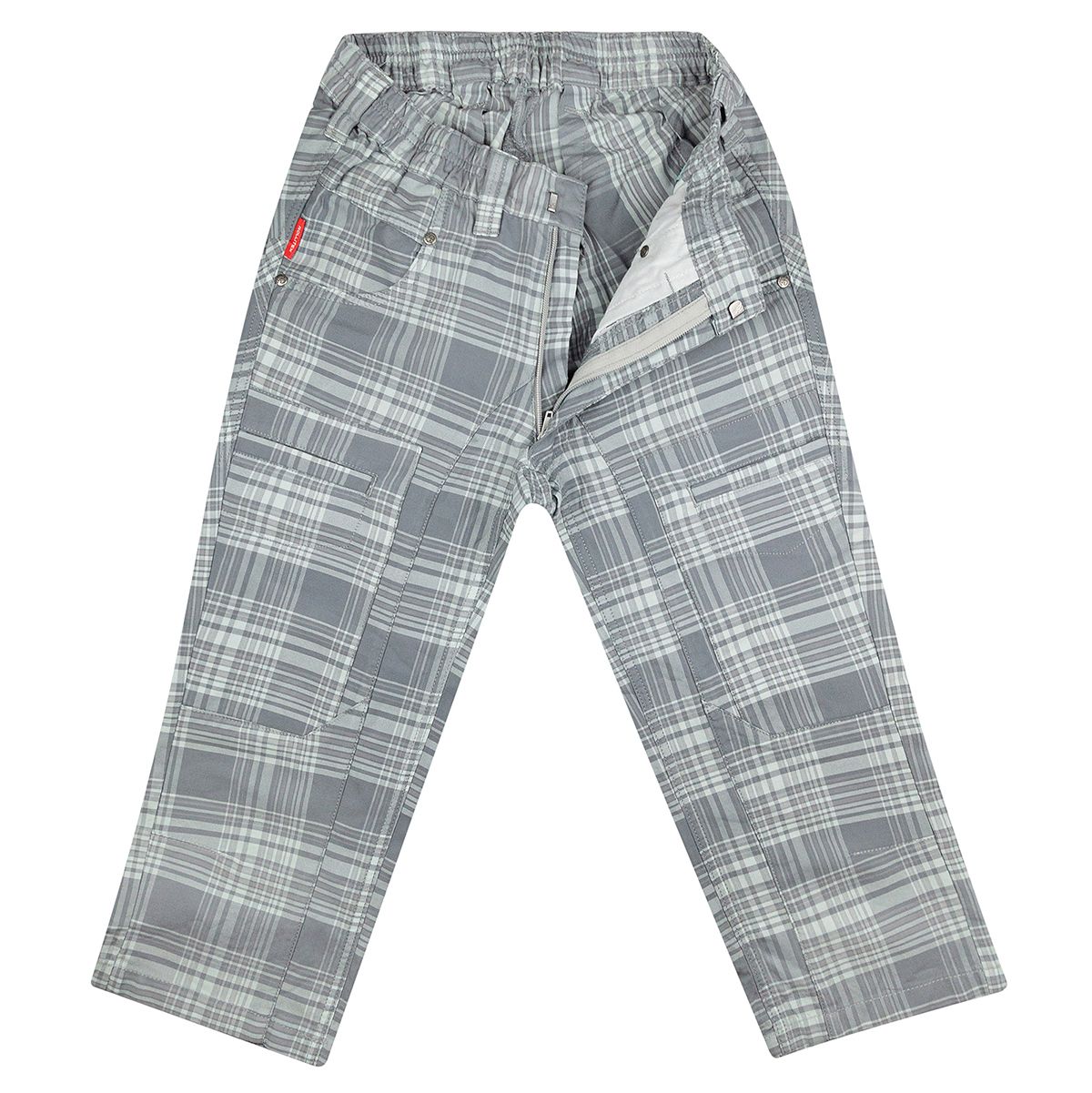 Met opgestikte zakken op de benen en steekzakken aan de voorkant.